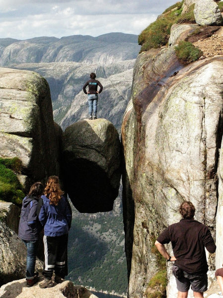Это место находить в Норвегии, этот камень застрял в расщелине горы Кьераг в Лисефьорде, и соединяет две горы, образуя мост".