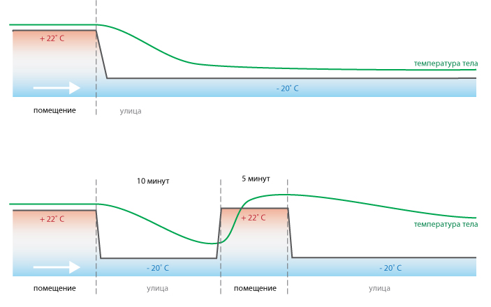 Это связано с инерцией организма в момент реакции на резкий холод. Стресс сужает капилляры кожи от холода пытаясь сохранить тепло и сократить вывод влаги которая сильно охлаждает тело. В тоже время запускается один из механизм дополнительного обогрева — незначительное увеличение температуры тела и повышенное сердцебиение и нужно лишь немного помочь организму. Выйдя на мороз на короткий промежуток времени запускается вышеупомянутый процесс, но чтобы не мешать ему сужеными капиллярами давая крови доставлять в кожные покровы больше тепла нужно всего лишь на 5 минут зайти в тёплое помещение. Организм по инерции не успеет остановить процесс дополнительного разогрева, а вновь расслабленные капилляры не будут этому препятствовать. И вот уже снова выходя на мороз вы абсолютно не почувствуете его обжигающего дыхания. Ваш организм успеет быстро «включиться» на полную мощь без дополнительных нагрузок.