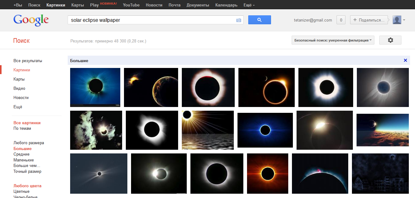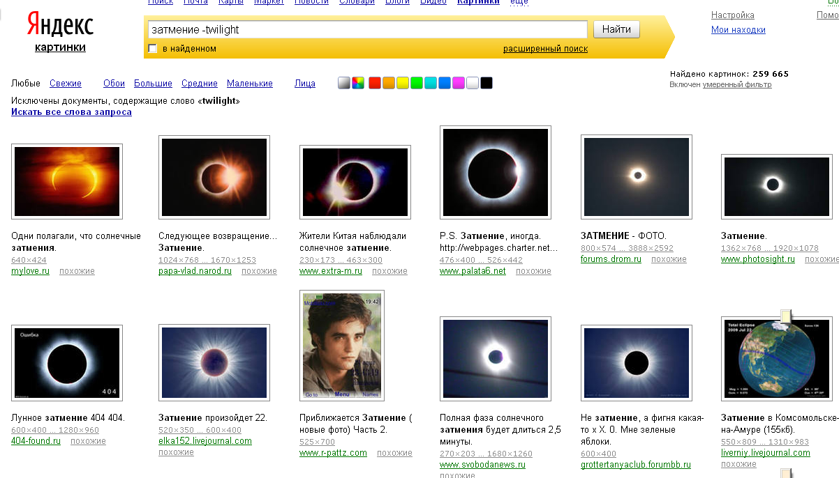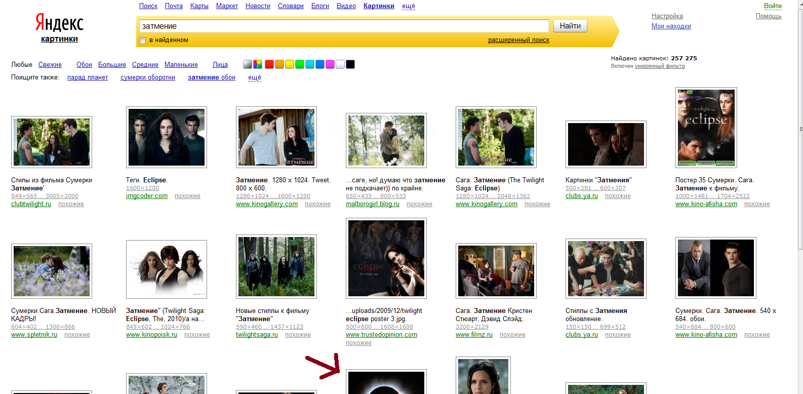 Решил на фоновую заставку поставить какую-нибудь эффектную картинку с восходом/закатом/затмением солнца - что больше понравится:) Первым ввёл в Яндекс "затмение". Итог(стрелкой показана первая картинка, которая удовлетворяет условию поиска):