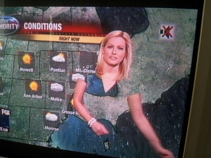 на самом деле ведущие прогноза погоды стоят на зеленом фоне, на который потом проэцируется картинка..ну, и соответственно, баба в зеленом получилась прозрачной