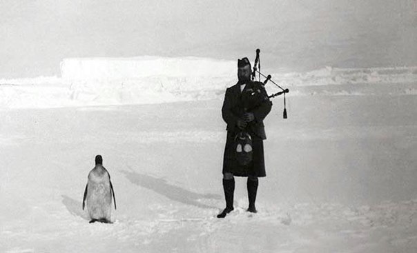 Участник Шотландской Национальной Антарктической Экспедиции играет на волынке для индифферентного пингвина. 1904 г.
