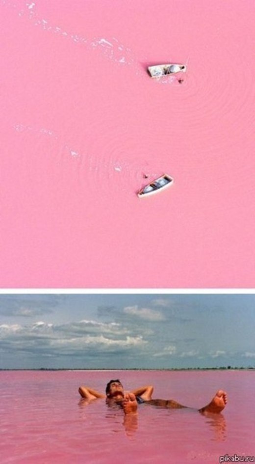 Эксперты говорят, что озеро окрашено в розовый цвет из-за сине-зеленых водорослей, безвредных галофильных бактерий в воде.