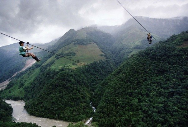 Каждое утро дети из одной маленькой деревни в Колумбии рядом с Боготой подобным образом добираются в школу. Ну, и не только дети, вообще все, кто живет по ту сторону от огромной долины с рекой Рио Негро. Со внешним миром жителей связывают всего лишь 12 стальных тросов, натянутых над долиной.