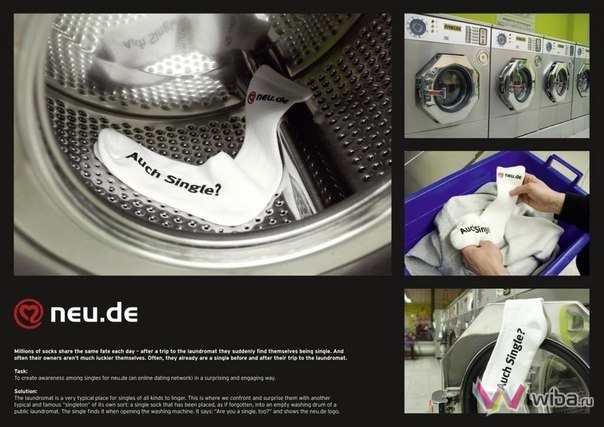 Немецкая служба знакомств: посетитель прачечной открывает люк стиральной машины, а там лежит чистый носок с надписью "Тоже один?", логотипом и адресом сайта знакомств.