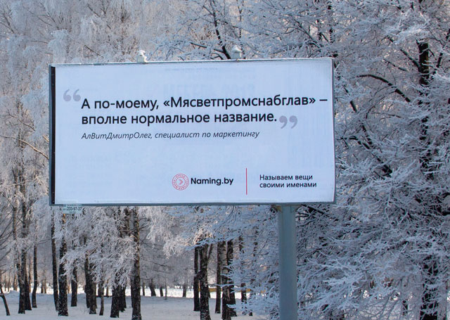 «Студия нейминга Naming.by, по всей видимости, отчаялась бороться с закостенелостью и шаблонными подходами белорусских предприятий в создании названий новых продуктов и решила разместить шутливые биллборды на эту тему.»