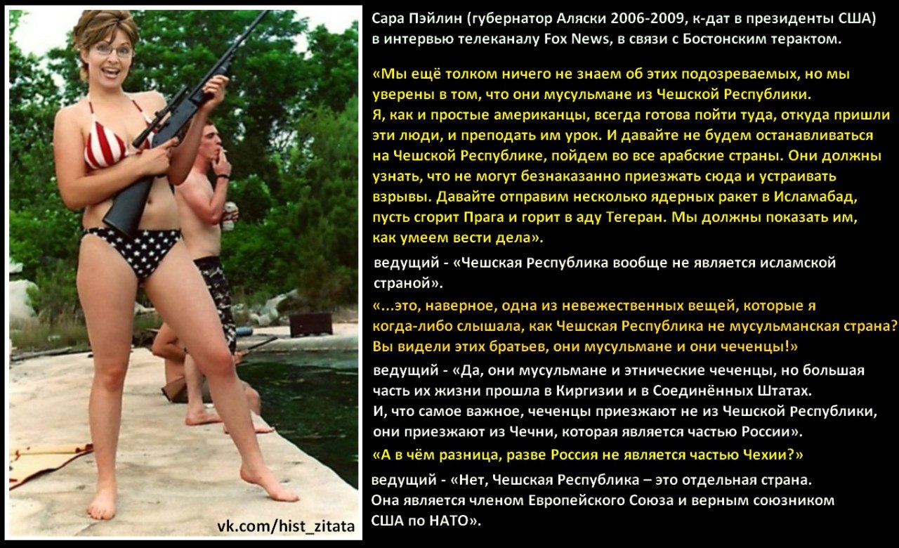 «Арабы должны уяснить, что не могут безнаказанно приезжать сюда и устраивать взрывы. Давайте отправим несколько ядерных ракет в Исламабад, пусть сгорит Прага и горит в аду Тегеран. Мы должны показать им, как умеем вести дела!» — приводили они в своих материалах слова, которые будто бы произнесла Сара Пэйлин.