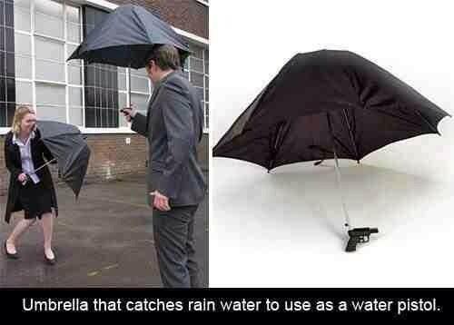 Хочу себе такой зонтик!)) Он накапливает воду дождя, которая используется для водного пистолетика