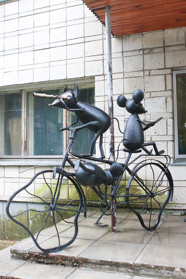 У общежития Специализированного учебно-научного центра НГУ (бывшая физико-математическая школа) появился памятник-велопарковка в виде железных мышат на велосипеде. Несмотря на то что памятник появился совсем недавно, он привлекает много внимания, а носы у мышат уже потерты.