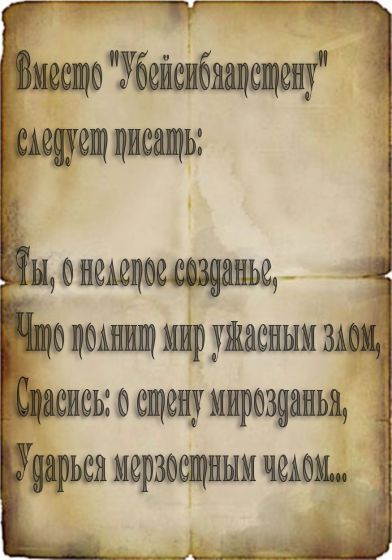 вместо "убей себя об стену" следует говорить "ты, о нелепое создание, что полнит мир ужасным злом, спасись: о стену мирозданья ударься мерзостным челом!"
